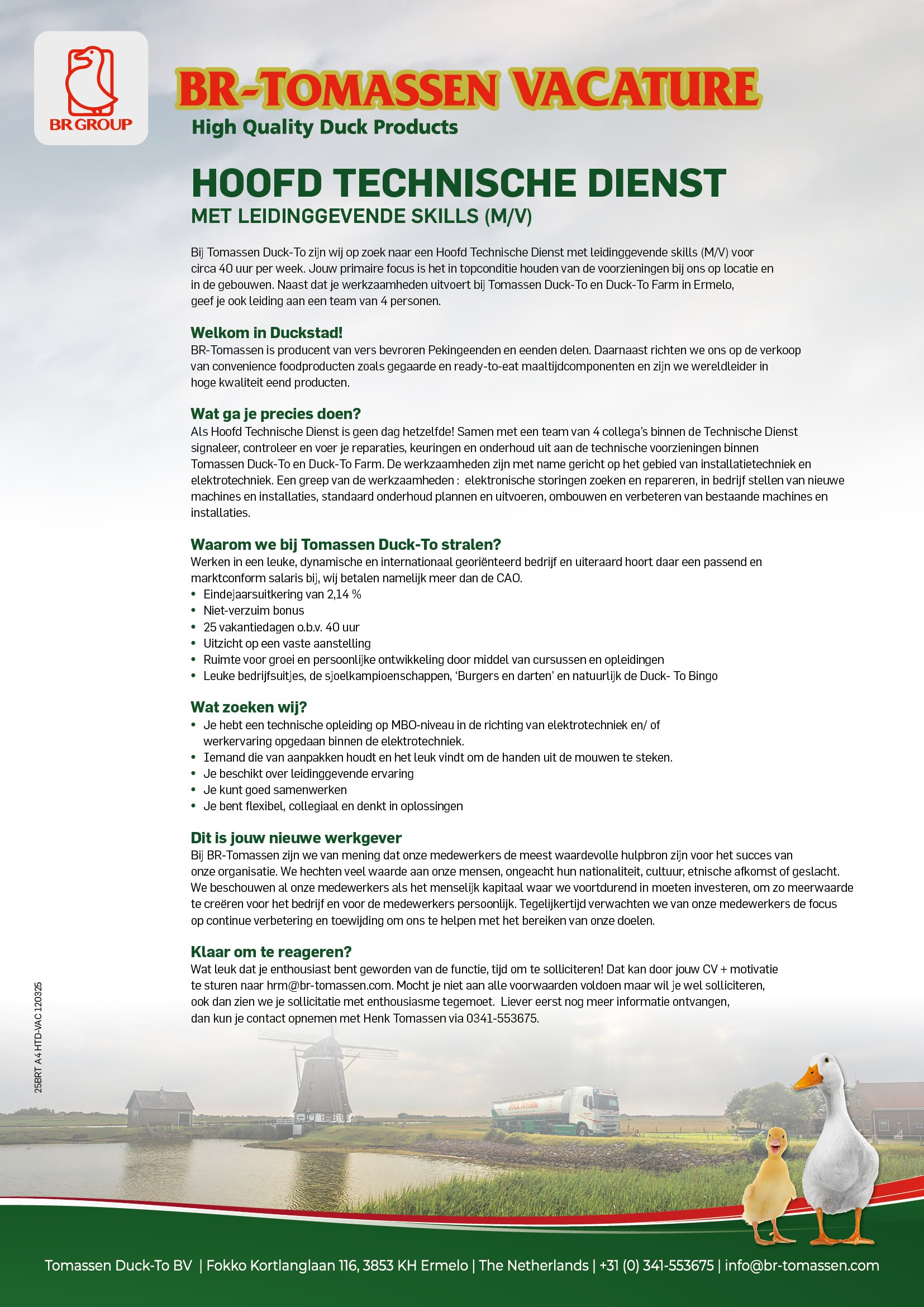 Als Hoofd Technische Dienst bij BR-Tomassen ben jij de drijvende kracht achter ons machinepark en technische installatie. Jij zorgt dat het technische team aangestuurd wordt, denkt proactief mee over verbeteringen en weet jouw team te motiveren.